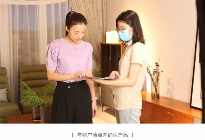 耐心解答客戶提出的關于家具保養的提問,同時將PA視訊產品使用說明書送給客戶,爾后教客戶如何掃描產品二維碼進行防偽鑒定,請顧客對貨物進行驗收檢查,然后正式簽收《產品配送單》。
