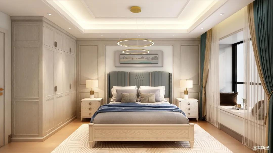 ▲臥室是居家的主要休息場所,在設計上需更注重舒適度。所以房間就以和諧淡雅的色彩為主,采用素雅柔和的線條布局,時尚輕奢的家具,使得空間更加的愜意和浪漫。床頭層林盡染裝飾畫,讓原本略偏美式淡雅的臥室在色彩上更添一筆。