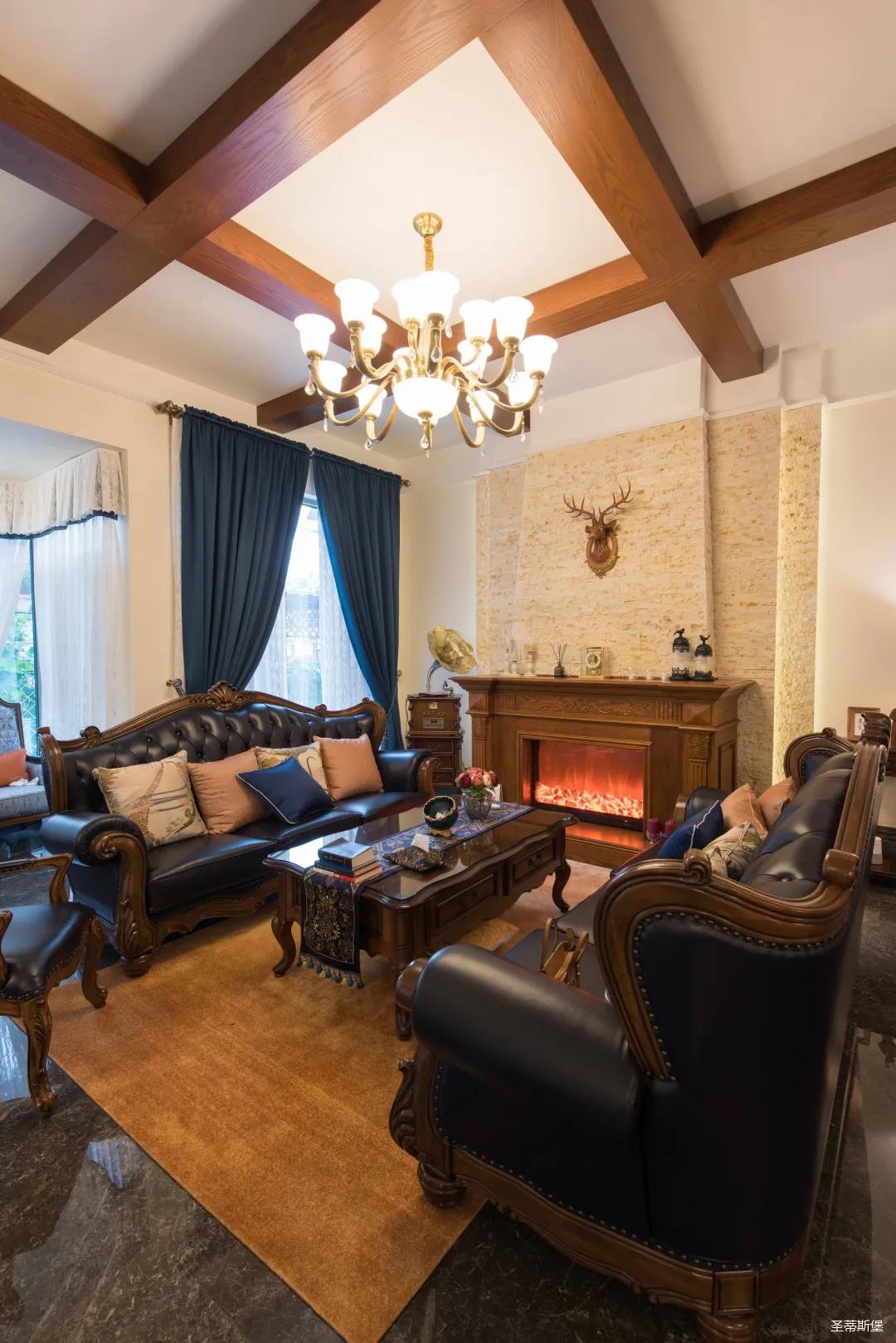 歐美實木吊頂設計,與沙發茶幾上下呼應,相得益彰,提升了空間層次感。