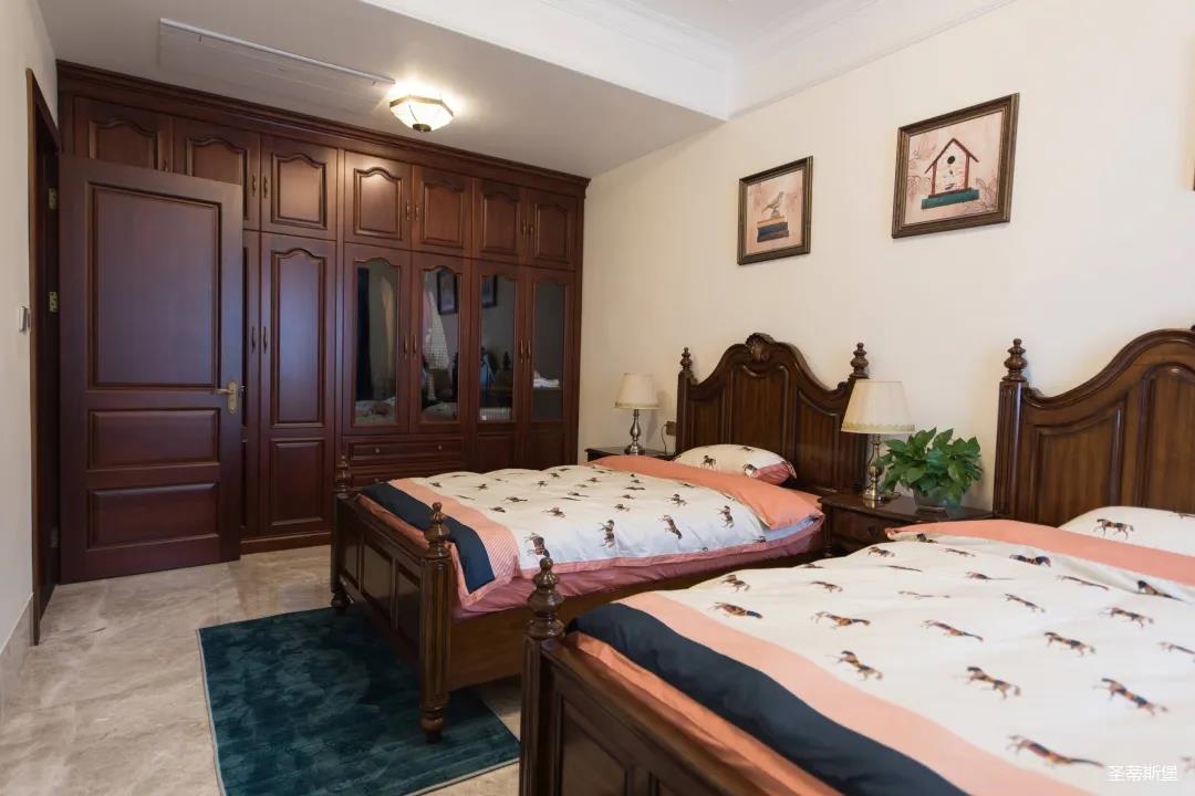 結合業主的需求,精簡打造客房,秉承了古典主義和諧對稱的原則。在中性復古的色彩中,調和出溫馨懷舊的味道。家具精雕細琢的品質,令空間沉浸在古典的氛圍里,讓居家生活親切而有靈魂!
