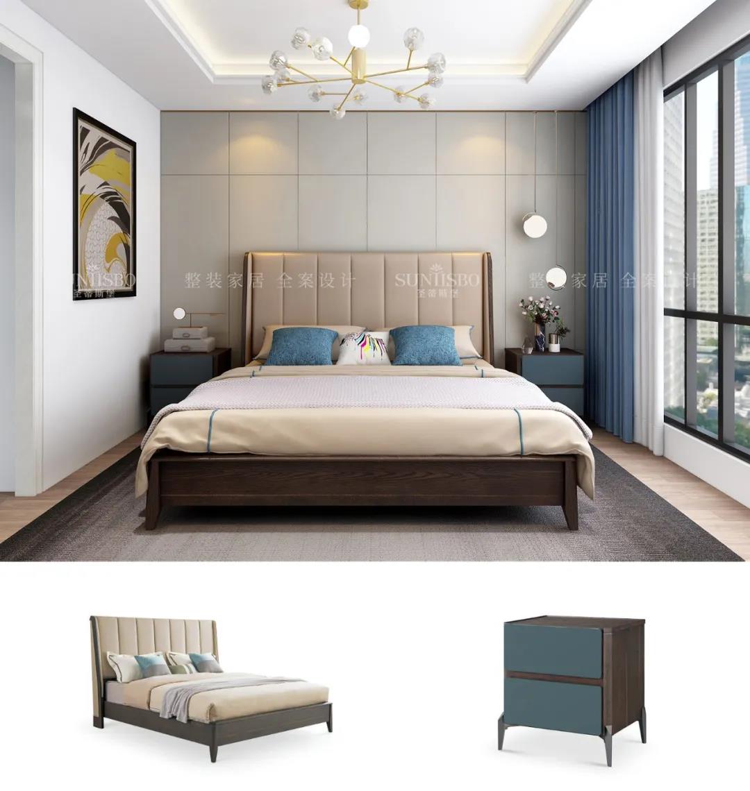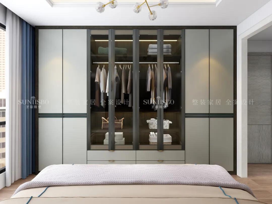 設(shè)計(jì)師運(yùn)用最為百搭淺灰實(shí)木護(hù)墻板打造主臥空間,簡(jiǎn)約的線條縱橫交錯(cuò),帶來了干凈、清爽、舒適的視覺效果。明暗分區(qū)的衣柜在燈光的渲染下,虛實(shí)光影變換其中,為每個(gè)角落氤氳出浪漫的氣息。