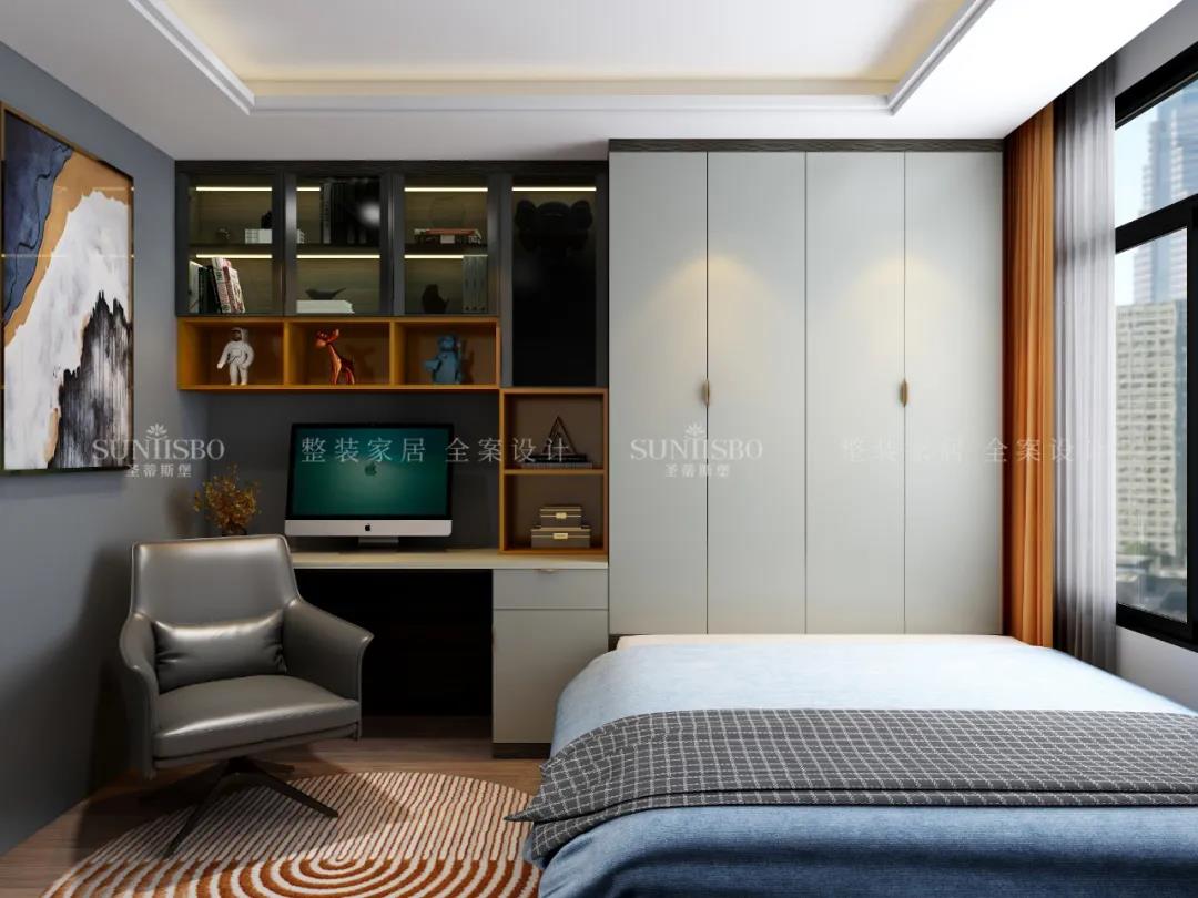 兒童房視覺上以簡(jiǎn)潔為主,書桌衣柜床一體式極簡(jiǎn)設(shè)計(jì),讓空間更輕便舒適。舒緩的色調(diào)與活躍的跳色合理搭配,營(yíng)造出一個(gè)充滿無限幻想的童話王國(guó)。