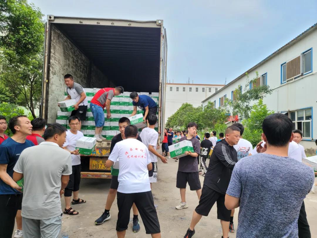 一輛滿載純凈水和食品等抗洪救災(zāi)物資的卡車,