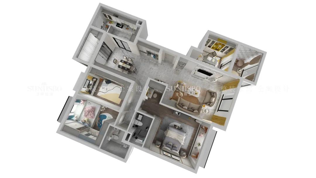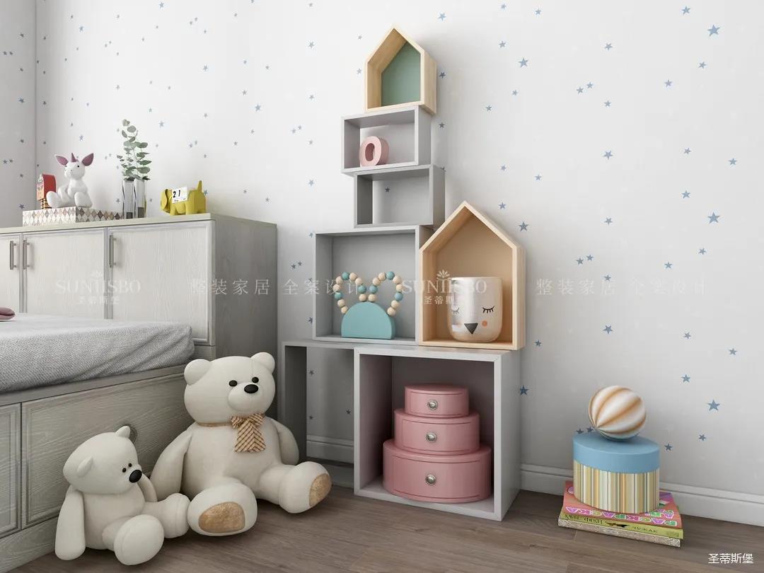 兒童房摒棄了傳統(tǒng)榻榻米的呆板與嚴肅,延續(xù)主臥輕奢雅致的空間氛圍,以木質(zhì)為主材質(zhì),利用面板的線條帶來視覺上的延伸,將童趣與理性相融表現(xiàn)兒童應(yīng)有的學習氛圍與生活習慣。開放式展示區(qū)應(yīng)用藍色點綴,再次強化了空間專屬兒童的活躍格調(diào),也呈現(xiàn)了設(shè)計師在材質(zhì)與色彩運用上的精細與專業(yè)。
