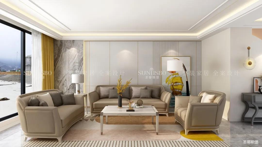 客廳設(shè)計置頂展示柜和大理石,實現(xiàn)了現(xiàn)代和輕奢風格間的均衡組合。溫柔莫蘭迪色調(diào)的沙發(fā),細節(jié)的實木底座和人性化的環(huán)抱式設(shè)計讓空間更添溫馨的氣息。