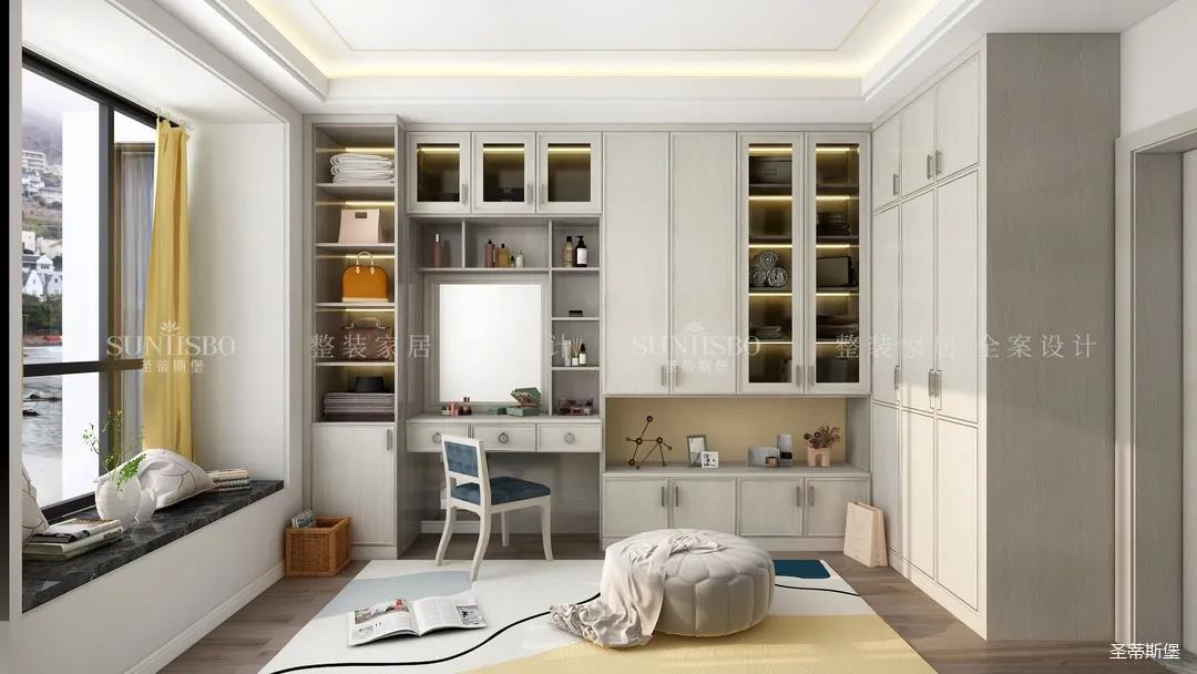 衣帽間是女主特別要求的,設(shè)計是將房間打造成衣帽間系統(tǒng),采用L型布局,壁掛式設(shè)計,讓穿搭動線更順暢,視覺上也更通透,可直觀的展示女主人穿搭品味。玻璃層板與背板花色的結(jié)合,精致靈動,成為時尚與輕奢的寫照,封閉區(qū)衣柜的合理格局規(guī)劃,完美詮釋現(xiàn)代輕奢風于當代定制中的前瞻性。