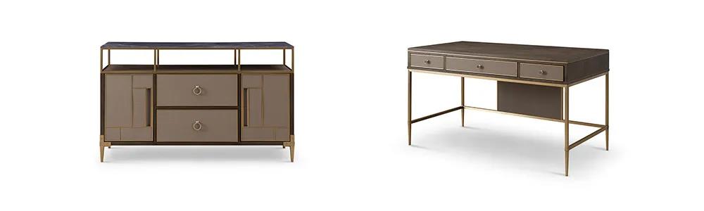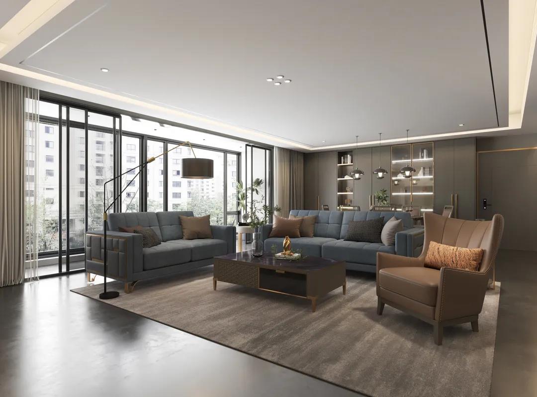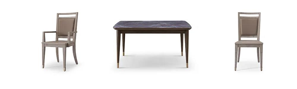 餐桌以簡潔干練造型為主,高級百搭的灰色調,軟包真皮,金屬鑲嵌的細節,打造出悠閑奢華、優雅精致的風格,讓家的味道從一日三餐中抵達內心深處。