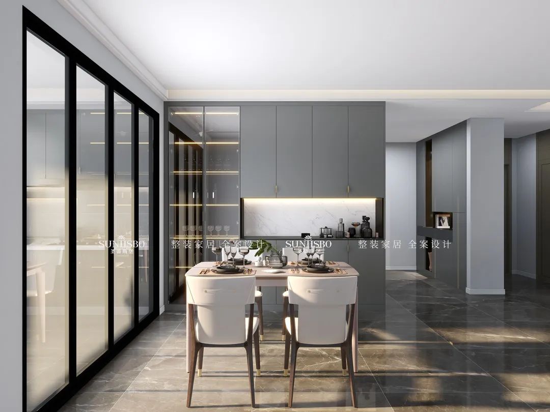 餐廳的設計采用整墻定制的餐邊柜,高級灰讓空間調性瞬間得到提升,半透明的玻璃展示區,營造了多樣的空間和充滿極簡藝術氣息的生活體驗。