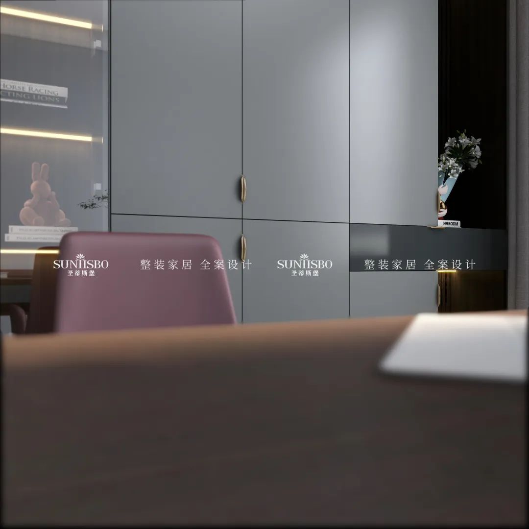 啞灰的定制書柜,冷靜理性,帶來思緒上井然有序的細密邏輯。天然原生的光感,讓視覺達到完美平衡。書房特意配上多裂綠植,讓現代簡約與傳統文化結合,萌發出別出心裁的設計,展現業主對傳統文化情結的喜愛。